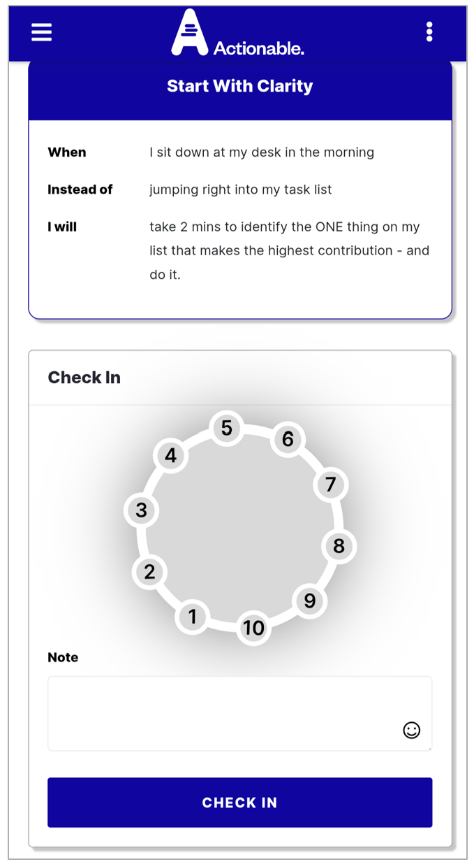 After following the link from your notification you'll reach your check-in screen. You can rate your progress with your commitment by selecting a number between 1 and 10.