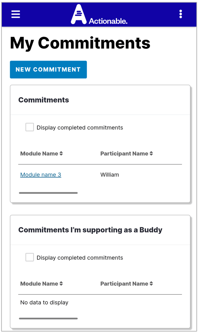 The Dashboard will show you all of your commitments (Active or completed), as well as Commitments you are supporting as a buddy. Click on the Commitment you'd like to view. You'll see your own as well any Buddy Commitments you've accepted.
