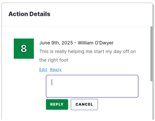 In the Action Details in either the check-in screen or from your commitment dashboard, you can add more reflections to any of your check-ins by clicking the "Reply" option below the specific check-in.