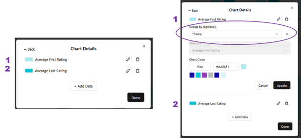 - Do this for EACH measure in your chart (E.g. If you have Average First Rating and Average Last Rating in your your widget list, you need to adjust the "Group by" option in each one to match).