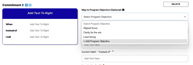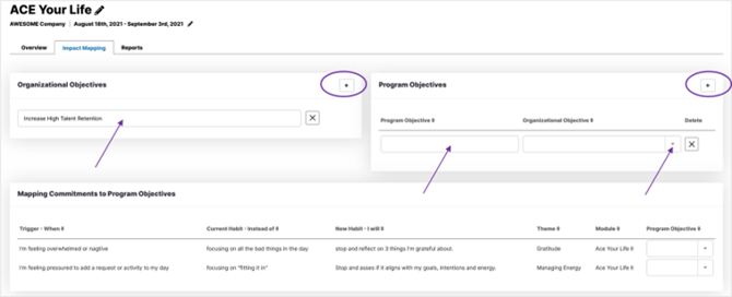 You can now when creating the commitments on the module tab, you can make use of our Auto Impact Mapping tool. This allows you to map your suggested commitments to Program Objectives right in the Commitment Tab. As well, any commitments with the same theme across your Modules will automatically update as your program runs.